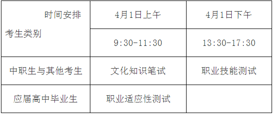往届高中毕业生以及没有普通高中学业水平考试成绩的社会考生可随中职生参加“文化知识”考试。文化基础知识考试满分300分,其中语文满分200分、数学满分100分。考试实行闭卷笔试,两科试卷同场考试,考试时间为120分钟。职业技能测试满分300分,主要考察考生的专业技能、心理素质、分析问题和解决问题能力等综合素质能力。测试方式采用分组实操测试。凡已获得县级以上职业资格证书或参加县级以上职业技能大赛并获奖的考生可免于参加中职毕业生职业技能测试。